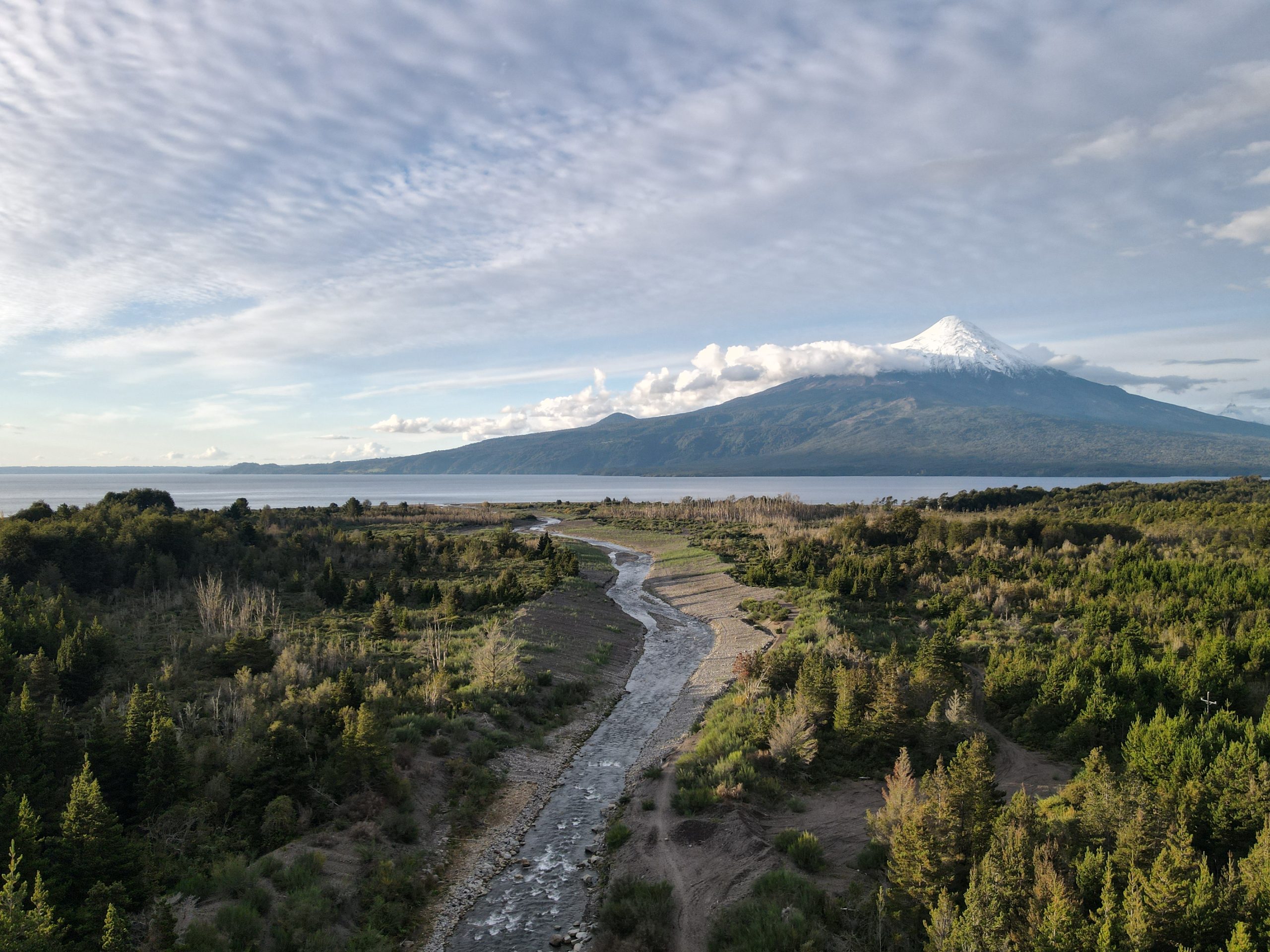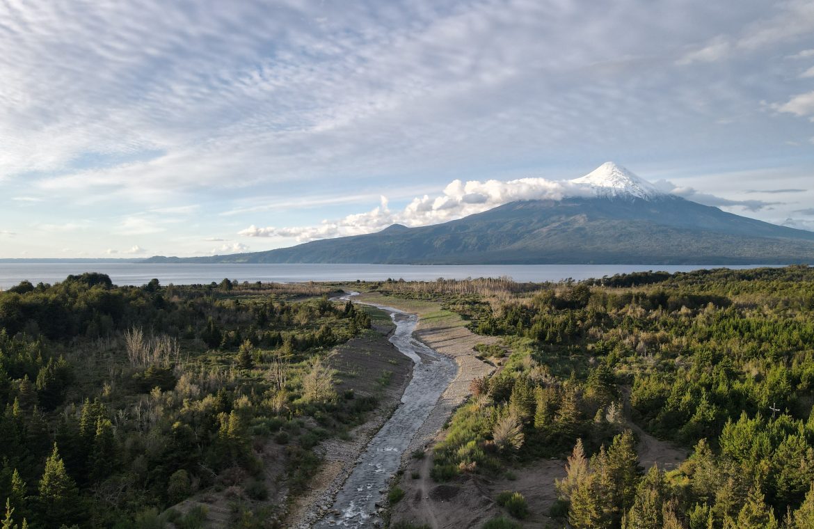 A tan solo 500 metros del lago Llanquihue, a orillas del río Tepu, con imponente y hermosa vista al volcán Osorno y Calbuco.